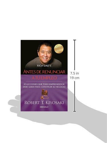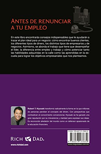 En Antes de renunciar a tu empleo Kiyosaki nos comparte sus éxitos, sus errores y las lecciones que ha aprendido. Habla de los puntos que debes cuidar antes de dar el gran paso de empleado a empresario, así como estrategias para recuperarte de un fracaso financiero. Cada capítulo corresponde a una lección y está acompañado de las excelentes reflexiones de Sharon Lechter a manera de resumen.